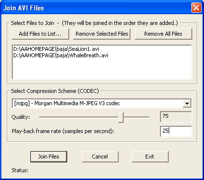 HandyAvi allows you to splice AVI files together. You can list several AVI files and create a new AVI file containing all of the spliced segments in one AVI movie file. (Note - the movie created will not contain any sound.)