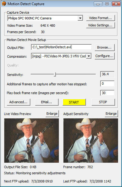 - The "Start" button will start the motion-detect video session. The "Live Video Preview window" will continue to show the images coming from the camera. The "Last motion detect frame" window will show the last image that was written to the AVI video file.