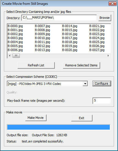 This HandyAvi tool allows you to make a movie from a directory containing a collection of still images. The movie will include the selected images. They will be placed in your new movie in alphabetical order according to their file names.